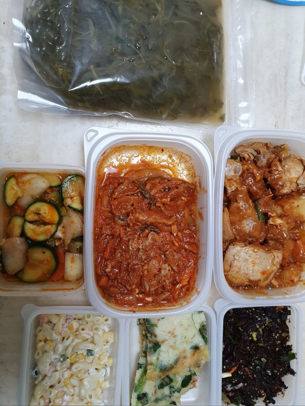제육볶음,파래무침,참나물팽이버섯전,매운호박볶음