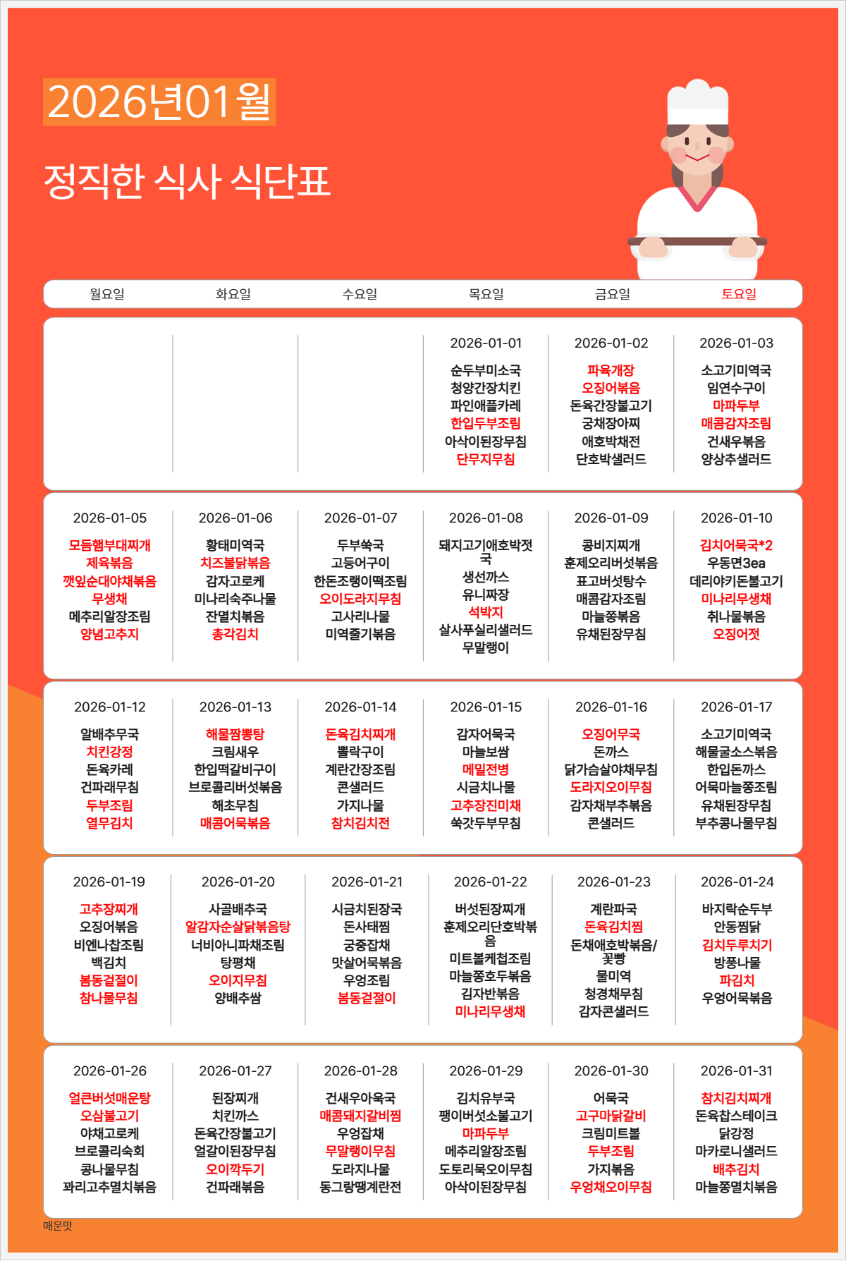 9월 13일(토) B식단 [파육개장 -> 어묵국]으로 대체됩니다.